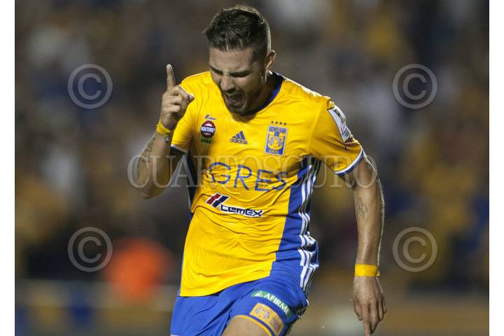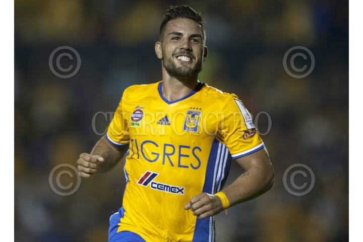 MONTERREY, NUEVO LEÓN, 18OCTUBRE2016.- Andy Delort del equipo de los Tigres de la UANL celebra el gol ante el el equipo del Heridiano, en el Estadio Universitario, partido correspondiente en fase de grupos de CONCACAF Liga de Campeones 2016. Marcador Final: Tigres: 3 - Heridiano: 0 FOTO: GABRIELA PÉREZ MONTIEL /CUARTOSCURO.COM