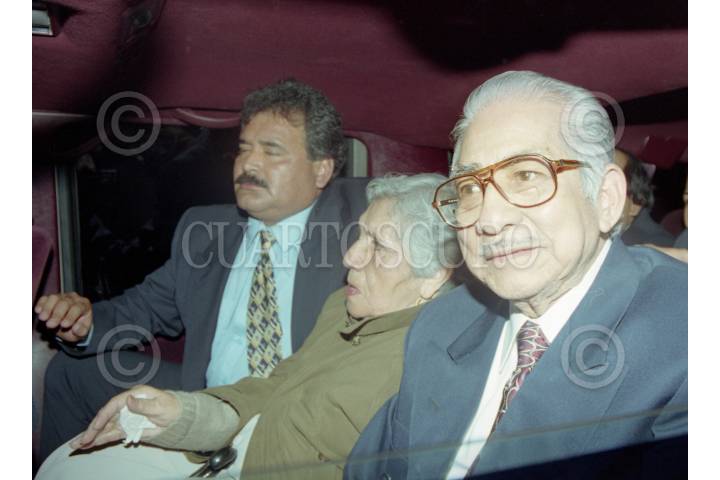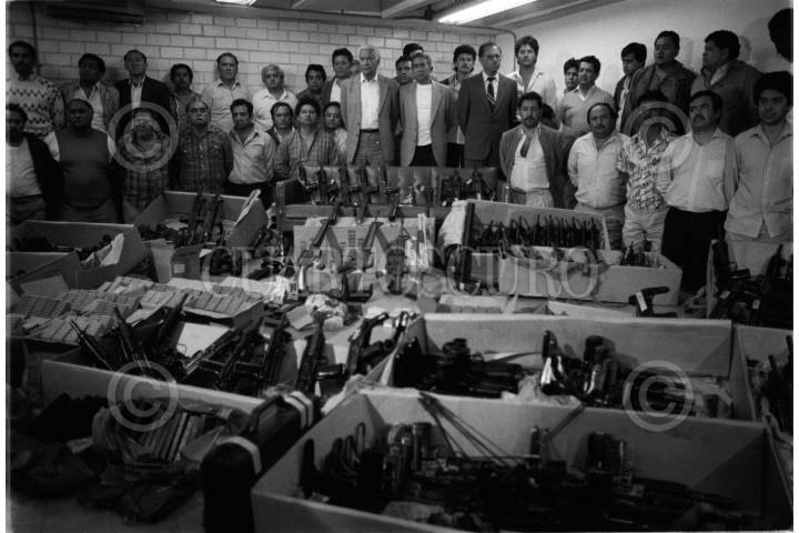 MÉXICO, D.F., 11NOVIEMBRE2013.- El ex líder petrolero Joaquín Hernández Galicia, alias “La Quina”, falleció este lunes a los 91 años de edad en Tamaulipas. “La Quina” padecía de una enfermedad del colon que mantenía en hospital privado Beneficencia Española. En la imagen Joaquín Hernández Galicia "La Quina" y otros detenidos ante las armas decomisadas en la judicial en 1989. FOTO: ARCHIVO /TOMÁS MARTÍNEZ /CUARTOSCURO.COM