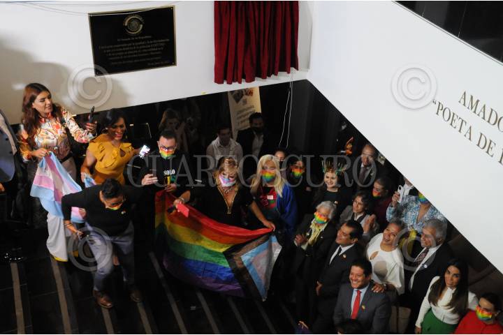 Un trabajador coloca la tradicional gama de colores de la bandera arcoirís en un aparador del Centro Histórico.