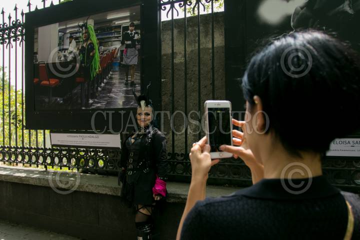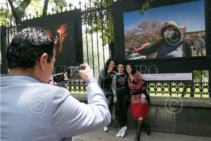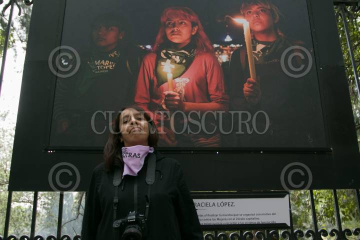 Graciela López, fotoperiodista de la agencia Cuartoscuro, posa con su fotografía durante la inauguración de la exposición de fotoperiodistas "Desde Nosotras".
