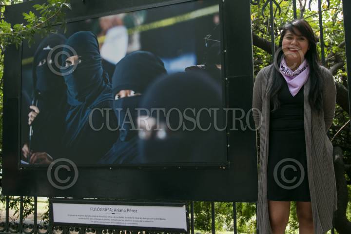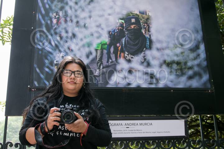 Andrea Murcia, fotoperiodista de la agencia Cuartoscuro, posa con su fotografía durante la inauguración de la exposición de fotoperiodistas "Desde Nosotras".