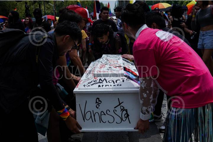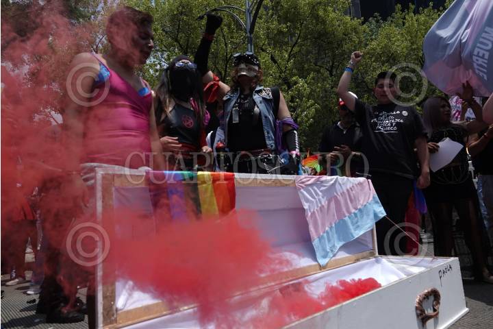 CIUDAD DE MÉXICO, 29JUNIO2024.- Integrantes de la comunidad Trans y activistas cargaron un ataúd durante la conmemoración de la 46º Marcha del Día Internacional del Orgullo (28 de junio) para exigir justicia y una Ley Integral para esta población vulnerada y violentada. FOTO: GALO CAÑAS/CUARTOSCURO.COM