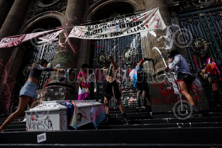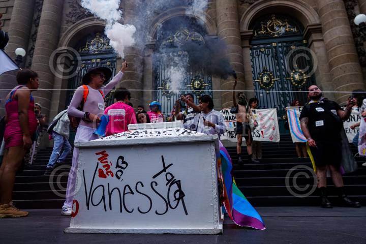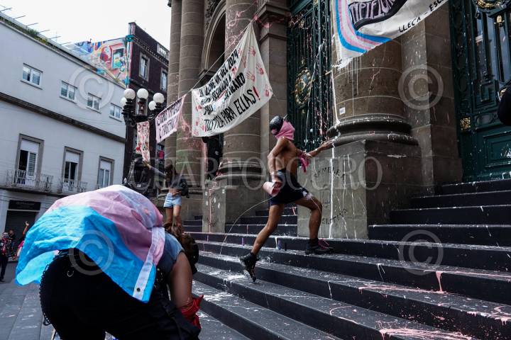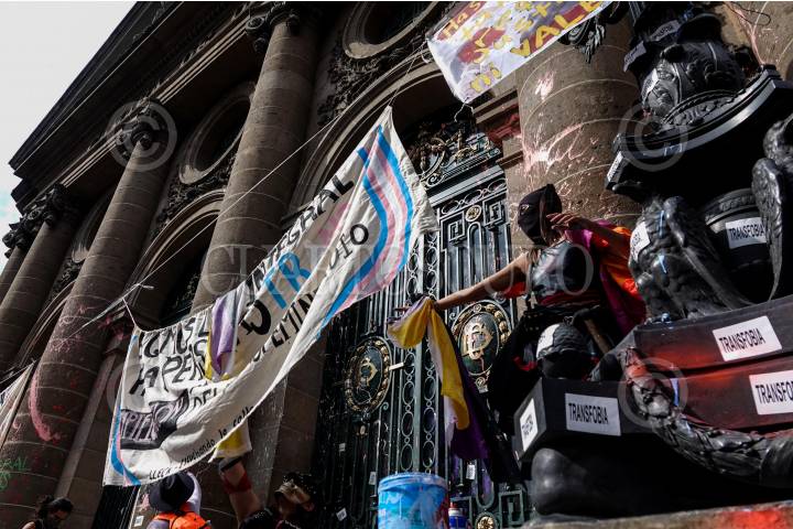 CIUDAD DE MÉXICO, 29JUNIO2024.- Integrantes del Bloque Disidente, Vive LVIHE, personas trans y disidencias sexuales intervinieron la fachada del Congreso de la Ciudad de México para exigir una ley integral para personas Trans, así como la tipificación del Transfeminicidio como crimen. Asimismo, nombraron a cada una de las personas trans asesinadas en lo que va del presente año. FOTO: GALO CAÑAS/CUARTOSCURO.COM