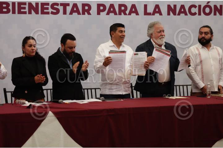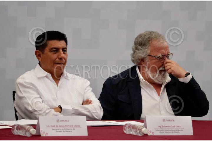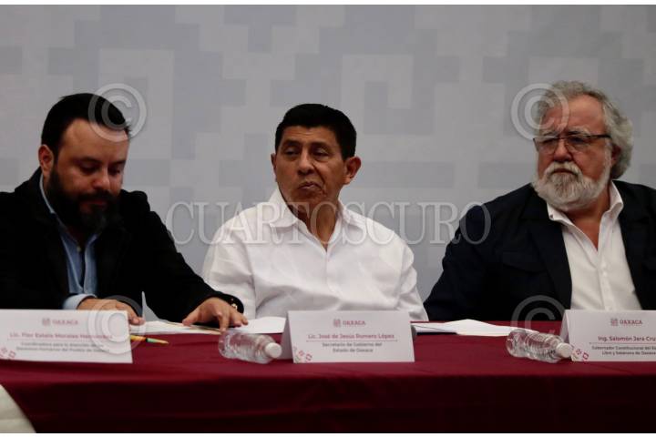 Salomón Jara Cruz y Alejandro Encinas Rodríguez durante la instalación de la mesa de construcción de paz con justicia y bienestar para la Nación Triqui en Oaxaca.