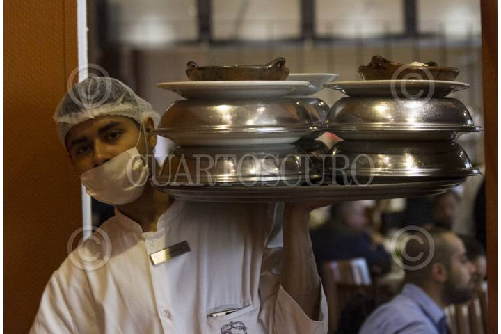 CIUDAD DE MÉXICO, 11AGOSTO2016.- Mesero carga charolas de comida en el restaurante El Cardenal, en el Centro Histórico. El investigador Roberto Gutiérrez Rodríguez de la Universidad Autónoma Metropolitana señalo que México es el país que tiene el nivel de salario mínimo más bajo de América Latina. FOTO: MOISÉS PABLO /CUARTOSCURO.COM