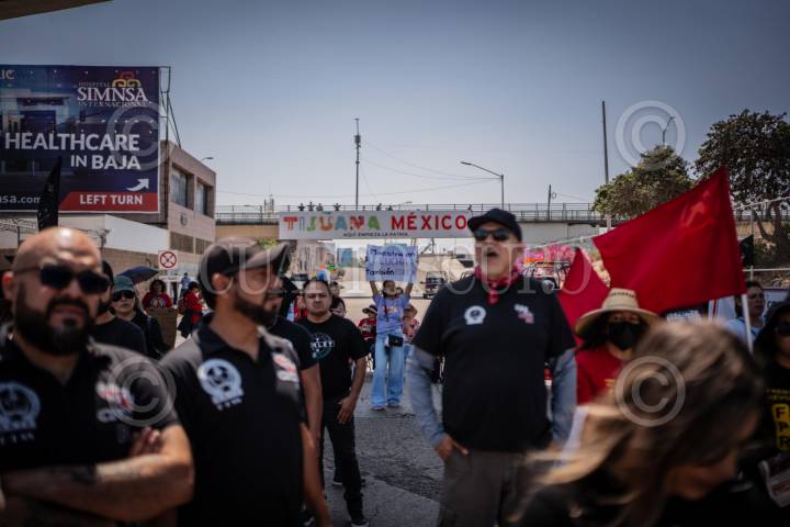 TIJUANA, BAJA CALIFORNIA, 2JUNIO2025.- Maestros con pancartas bloqueando el acceso vehicular a Tijuana por la garita del Chaparral. Maestros de la Coordinadora Nacional de Trabajadores de la Educación (CNTE) bloquearon esta mañana el carril de salida hacia México en la Garita El Chaparral, en Tijuana, como parte de una protesta para exigir mejores prestaciones laborales y la abrogación de la Ley del ISSSTE 2007. Gerónimo Castro, coordinador de la CNTE en Tijuana, explicó que eligieron este punto fronterizo para visibilizar internacionalmente su inconformidad con las reformas que eliminaron los beneficios previos a 2007 y obligaron a los nuevos docentes a cotizar en AFORES. A la protesta acudieron maestros de diversas regiones de Baja California. Según Édgar Lizárraga, secretario general de la D-188, el bloqueo es un llamado a la presidenta para que cumpla sus promesas de campaña. FOTO: CHRIS NOYOLA/ CUARTOSCURO.COM