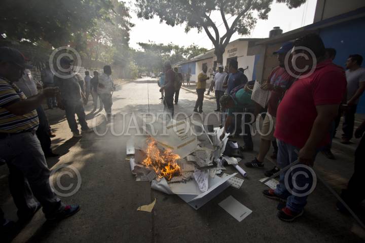 JUCHITÁN, OAXACA, 07JUNIO2015.- Este domingo se vivió una jornada electoral con mucha participación tanto de los profesores adjuntos al Sindicato Nacional de Trabajadores de la Educación, como del ejército mexicano en conjunto con las fuerzas policiales del Estado y municipales; mientras los maestros marchaban por las calles de la ciudad con el propósito de echar abajo las elecciones federales, consiguieron quemar más de 60 urnas, sin hacer daño a ni un civil y las fuerzas del orden público, accionaron de manera pacifica hasta cierto punto, siguiendo la marcha de cerca para prevenir cualquier tipo de violencia que pudiera suscitarse, recordando que en la ciudad de Pochutla, la sociedad civil enfrento a los adjuntos de la SNTE el pasado sábado 06 de junio, hasta el momento los comicios penden de un hilo, para declararse una elección fallida. FOTO: FREYNA LUCERO /CUARTOSCURO.COM