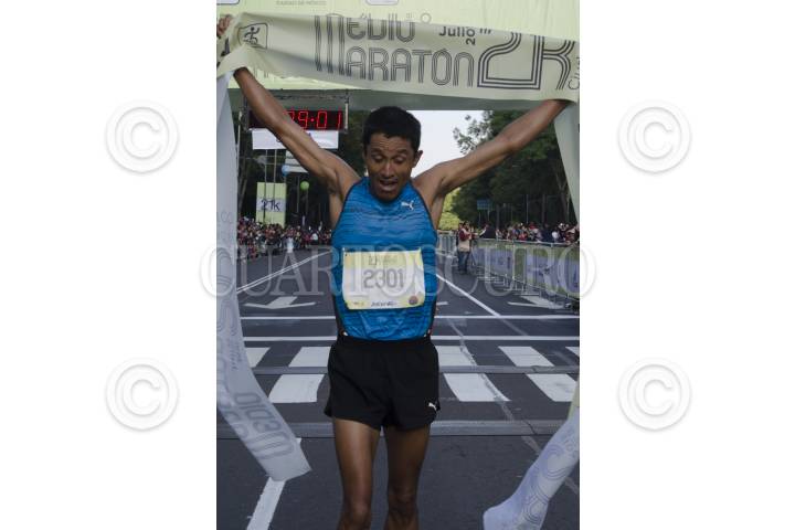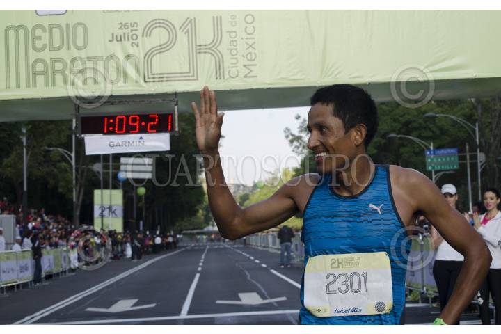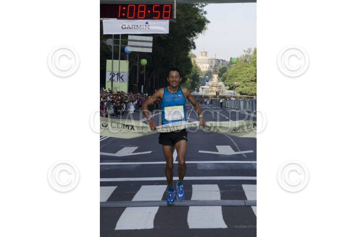MÉXICO, D.F., 26JULIO2015.- En la imagen, Tomás Luna, primer lugar del Medio Maratón 21 KM de la Ciudad de México, organizado por el Instituto del Deporte (Indeporte), que tuvo como salida y meta la glorieta del Ángel de la Independencia y atravesó algunas de las principales avenidas de la zona, como Reforma, Mariano Escobedo, y Mazaryk. Esta actividad forma parte de la agenda deportiva convocada por el gobierno capitalino en víspera de la edición del XXXIII del Maratón de la Ciudad de México que se realizará el próximo 30 de agosto, que retomará la Ruta Olímpica, con salida en el Hemiciclo a Juárez y la meta en el Estadio Olímpico Universitario. FOTO: MARÍA JOSÉ MARTÍNEZ /CUARTOSCURO.COM