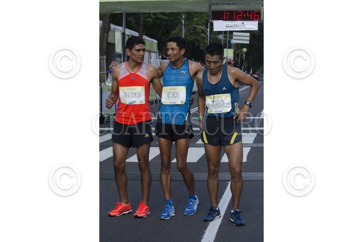 MÉXICO, D.F., 26JULIO2015.- De izquierda a derecha, los tres primeros lugares, Jesús Isidro Chávez, el primer lugar Tomás Luna, y Arturo Cortés. En promedio 20 mil corredores participaron esta mañana en el Medio Maratón 21 KM de la Ciudad de México, organizado por el Instituto del Deporte (Indeporte), que tuvo como salida y meta la glorieta del Ángel de la Independencia y atravesó algunas de las principales avenidas de la zona, como Reforma, Mariano Escobedo, y Mazaryk. Esta actividad forma parte de la agenda deportiva convocada por el gobierno capitalino en víspera de la edición del XXXIII del Maratón de la Ciudad de México que se realizará el próximo 30 de agosto, que retomará la Ruta Olímpica, con salida en el Hemiciclo a Juárez y la meta en el Estadio Olímpico Universitario. FOTO: MARÍA JOSÉ MARTÍNEZ /CUARTOSCURO.COM