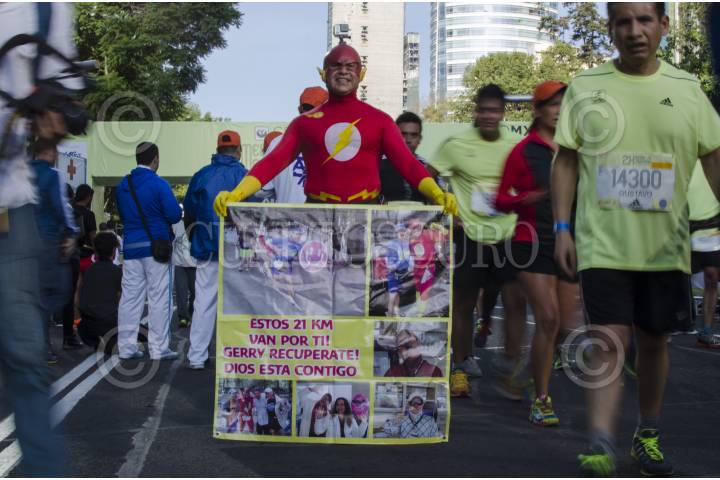 MÉXICO, D.F., 26JULIO2015.- Flash Runner, el corredor con causa, levanta una manta que contiene fotografías de Gerry, su amigo corredor, quien sufrió una fuerte lesión en días pasados y debe someterse a un trasplante de médula ósea. En promedio 20 mil corredores participaron esta mañana en el Medio Maratón 21 KM de la Ciudad de México, organizado por el Instituto del Deporte (Indeporte), que tuvo como salida y meta la glorieta del Ángel de la Independencia y atravesó algunas de las principales avenidas de la zona, como Reforma, Mariano Escobedo, y Mazaryk. FOTO: MARÍA JOSÉ MARTÍNEZ /CUARTOSCURO.COM