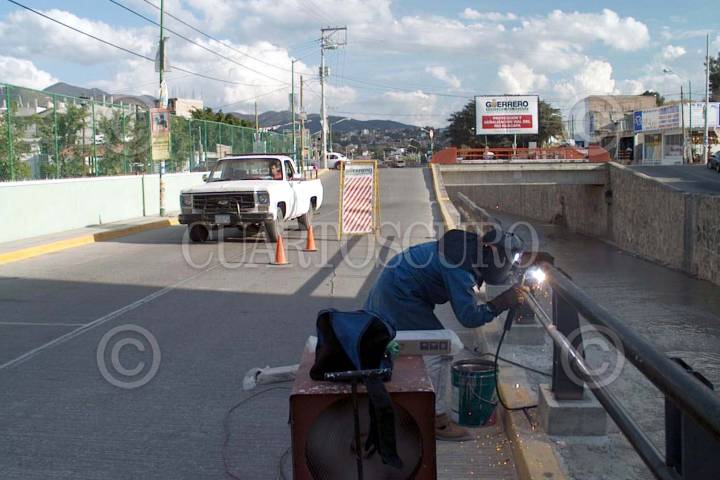 CHILPANCINGO, GUERRERO, 27DICIEMBRE2004.- Trabajadores del gobierno estatal, colocan barreras de protección metálica sobre el paseo Alejandro Cervantes Delgado de la ciudad de Chilpancingo, Guerrero para prevenir que ocurran más accidentes automovilísticos sobre esa arteria vehicular. FOTO: Oscar Alvarado/CUARTOSCURO.COM
