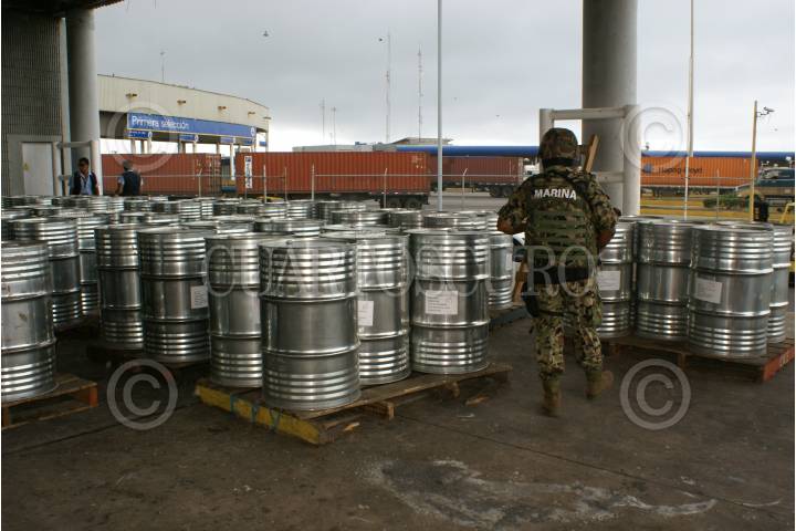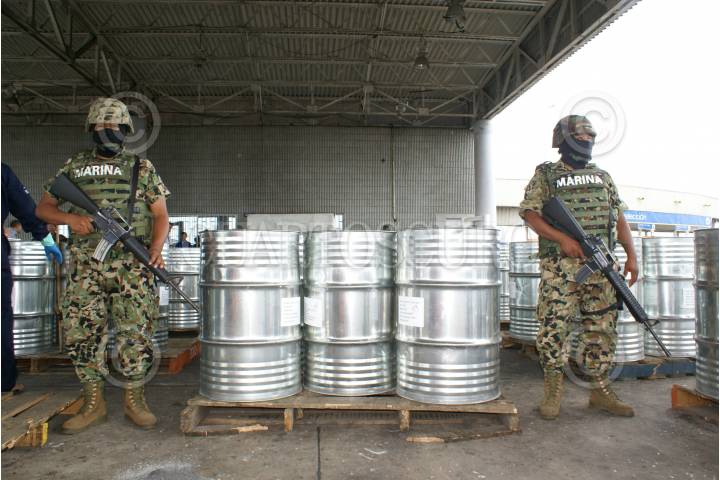 VERACRUZ, VERACRUZ, 16JUNIO2010.- Elementos de la Secretaria de Marina, realizaron el aseguramiento de 16 mil litros de fenil acetato de etilo en 80 tambos metálicos con capacidad de 200 litros en la aduana del puerto de esta entidad. FOTO: SEMAR/CUARTOSCURO.COM