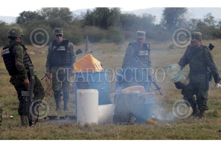 HUANDACAREO, MICHOACÁN, 03NOVIEMBRE2013.- Efectivos del doceavo batallón de infantería, adscritos a la 21 zona militar, localizaron y destruyeron un narco laboratorio para elaborar droga sintética, en las cercanías del lago de Cuitzeo. En dicho lugar, los uniformados encontraron y aseguraron un reactor para procesar droga, 950 gramos de droga sintética terminada, 15 costales de 25 kilos de sosa caustica, cuatro sacos de ácido tartárico de 25 kilos, dos secadoras de ropa y dos exprimidores industriales. Además de esto, encontraron tres tinas de 50 litros con residuos de sustancias químicas, un tinaco Rotoplas de 750 litros, un tanque de gas LP de 30 kilos, cuatro quemadores industriales, 20 botes de 19 litros con residuos químicos, dos macaras antigas, un destilador y un rollo de papel aluminio industrial. FOTO: ALAN ORTEGA /CUARTOSCURO.COM