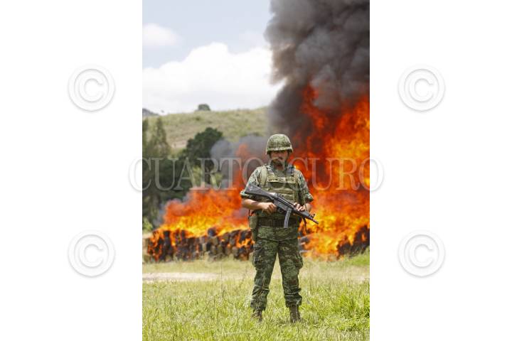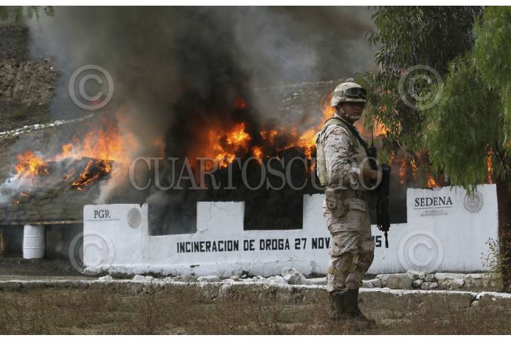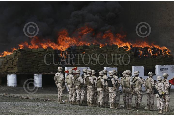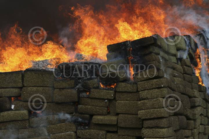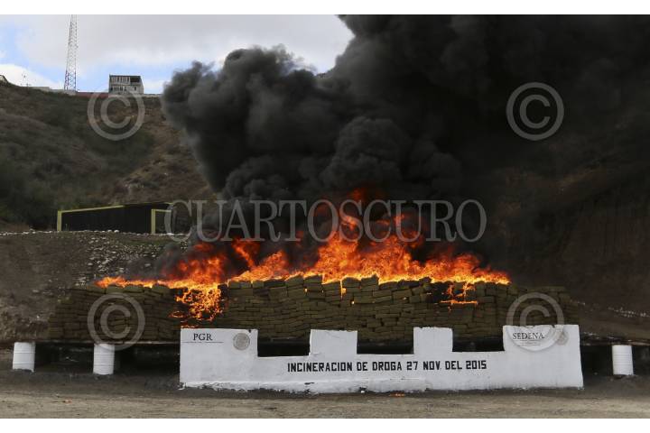 TIJUANA, BAJA CALIFORNIA, 27NOVIEMBRE2015.- Ante la presencia de autoridades federales y estatales, fueron incineradas 19 toneladas de diversas drogas en una ceremonia realizada en el Cuartel Militar del Aguaje de la Tuna; se destruyeron 17 toneladas de marihuana, 1.2 toneladas de metanfetamina, 86 kilogramos de cocaína y 6 kilogramos de heroína. Los decomisos fueron realizados por autoridades de los tres niveles de gobierno a distintos grupos criminales que operan en la ciudad. FOTO: CHRISTIAN SERNA /CUARTOSCURO.COM