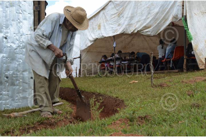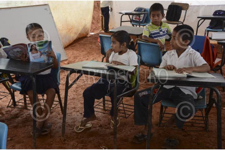 CHILAPA, GUERRERO, 12SPETIEMBRE2014.- Los días 14,15 y 16 de septiembre de 2013 las torrenciales lluvias de Manuel e Ingrid causaron deslaves de cerros y laudes de tierra en la comunidad San Marcos Majada de Toro, en la sierra de Chilapa, lo que dejó incomunicados a más de mil 600 ciudadanos. A un año de las tormentas más de 450 familias no han sido reubicadas y el apoyo por parte de los tres niveles de gobierno es nulo. Sólo los integrantes del Cártel de los Ardillos han apoyado con comida, cobertores y agua a los pobladores, quienes temen ahora por la nueva temporada de huracanes, pues ni siquiera han podido recuperarse de la anterior. En la imagen, niños de la primaria bilingüe Tezcatlipoca, quienes deben tomar clases entre el lodo y las lluvias, pues la escuela se derrumbó en los deslaves. FOTO: BERNANDINO HERNÁNDEZ /CUARTOSCURO.COM