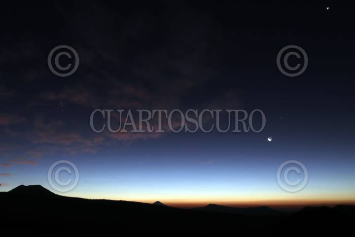 XALATLACO, ESTADODEMÉXICO, 02FEBRERO2019.- Al amanecer, en el horizonte, a la derecha se observa la conjunción de la Luna menguante, y el planeta Saturno en la esquina superior. Abajo se delinean las siluetas de los volcanes Pelado, Popocatépetl y Chichinautzin. FOTO: MARGARITO PÉREZ RETANA /CUARTOSCURO.COM