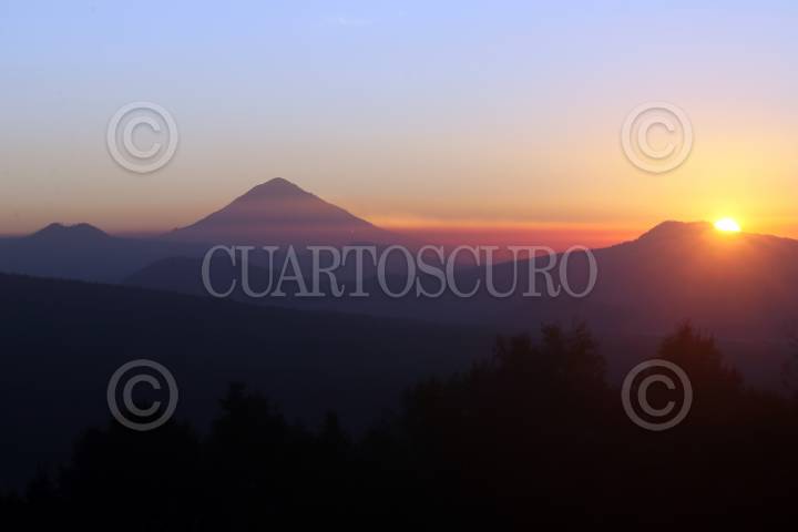 XALATLACO, ESTADODEMÉXICO, 02FEBRERO2019.- El Sol emerge detrás del volcán Chichinautzin. A la izquierda, el Popocatépetl y el monte Tláloc. FOTO: MARGARITO PÉREZ RETANA /CUARTOSCURO.COM