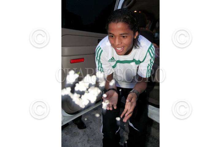 MÉXICO, D.F., 04SEPTIEMBRE2007.- Giovani Dos Santos, delantero de la Selección Nacional, juega con el granizo que cubrió la cancha sobre la que el conjunto tricolor realizaba su práctica en el Centro de Alto Rendimiento, con miras al partido en contra de Panamá de este domingo. FOTO: ISAAC ESQUIVEL/CUARTOSCURO.COM