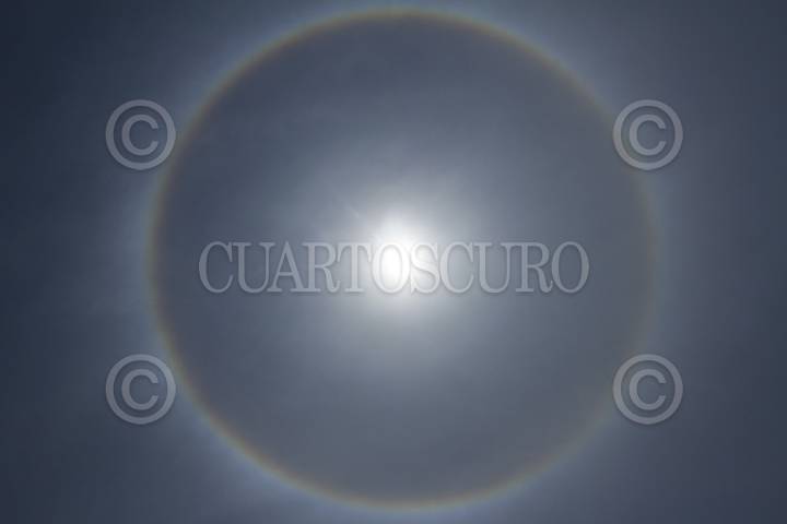 MÉXICO, D.F., 12JULIO2013.- Un halo solar se observó esta tarde en la ciudad de México, el cual es causado por partículas de hielo en suspensión en la troposfera que refractan la luz haciendo un espectro de colores del astro rey. FOTO: ISAAC ESQUIVEL /CUARTOSCURO.COM