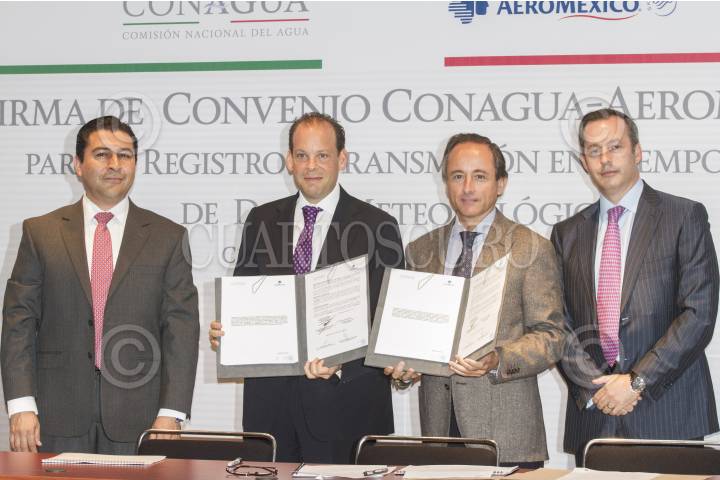 MÉXICO, D.F., 21AGOSTO2014.- David Korenfeld, titular de Conagua, Eduardo Tricio Haro, presidente del Consejo de Administración de Aeromexico, y Andrés Conesa Labastida, director general de Grupo Aeromexico, durante la firma de un convenio de colaboración entre las dos instituciones. FOTO: ISAAC ESQUIVEL /CUARTOSCURO.COM