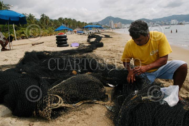 ACAPULCO, GUERRERO 29DICIEMBRE2005.- Pese a lo contaminado de la bahía y a nuevos metodos de pesca, El chinchorro, red que es tendida a lo largo de la bahía y arengado manualmente por decenas de hombres, sigue siendo el metodo mas utilizado para pescar en el puerto de Acapulco. En la foto un pescador prepara las redes antes de ser lanzadas al mar. FOTO: Miguel Dimayuga/CUARTOSCURO.COM