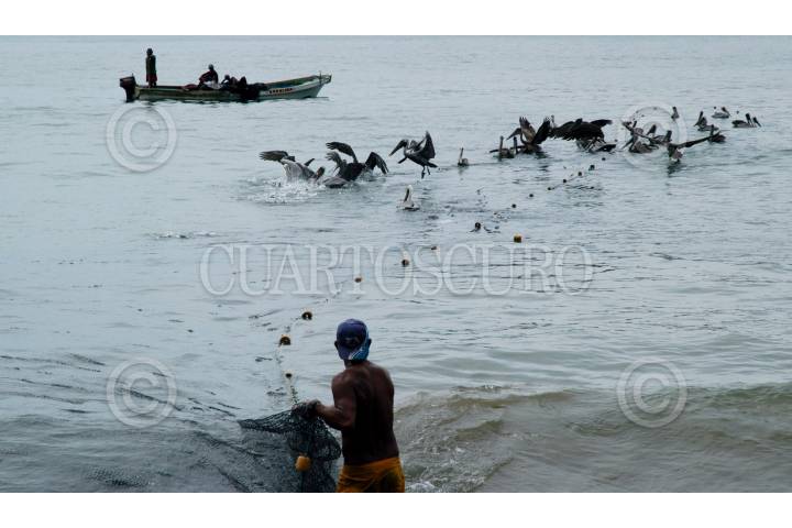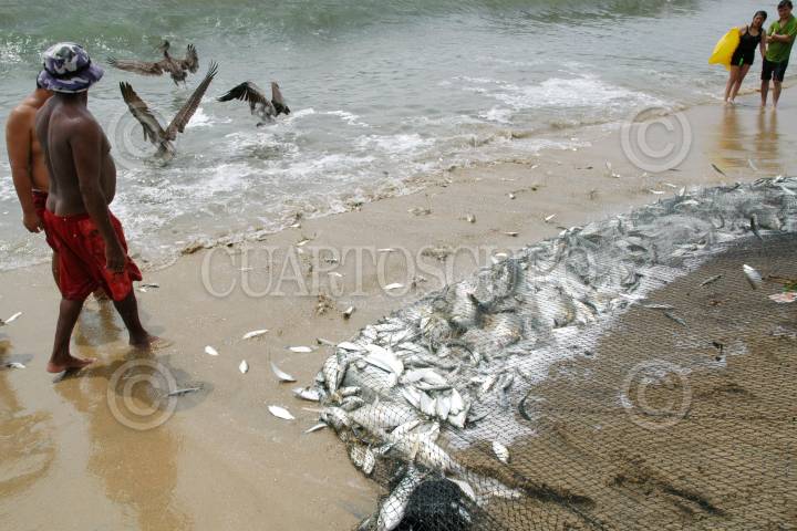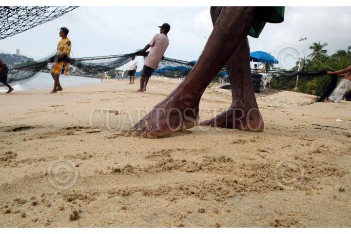 ACAPULCO, GUERRERO 29DICIEMBRE2005.- Pese a lo contaminado de la bahía y a nuevos metodos de pesca, El chinchorro, red que es tendida a lo largo de la bahía y arengado manualmente por decenas de hombres, sigue siendo el metodo mas utilizado para pescar en el puerto de Acapulco. Barriletes, jureles, cocineros y pequeños cazones son atrapados entre las redes del chinchorro. FOTO: Miguel Dimayuga/CUARTOSCURO.COM