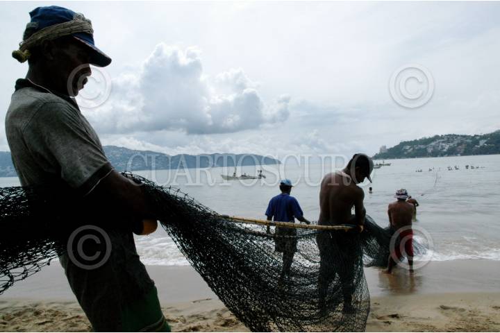 ACAPULCO, GUERRERO 29DICIEMBRE2005.- Pese a lo contaminado de la bahía y a nuevos metodos de pesca, El chinchorro, red que es tendida a lo largo de la bahía y arengado manualmente por decenas de hombres, sigue siendo el metodo más utilizado para pescar en el puerto de Acapulco. FOTO: Miguel Dimayuga/CUARTOSCURO.COM