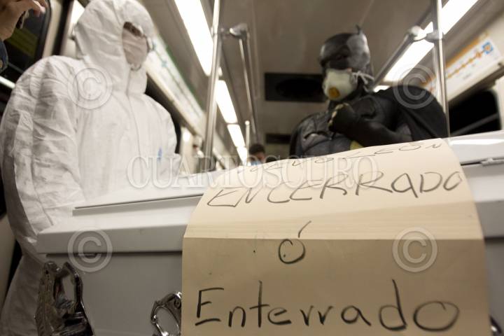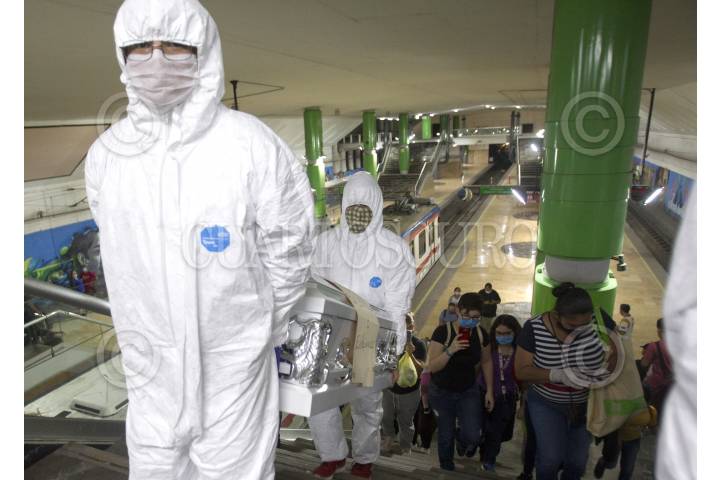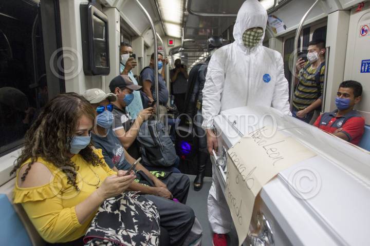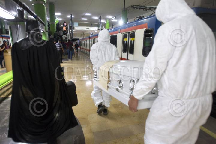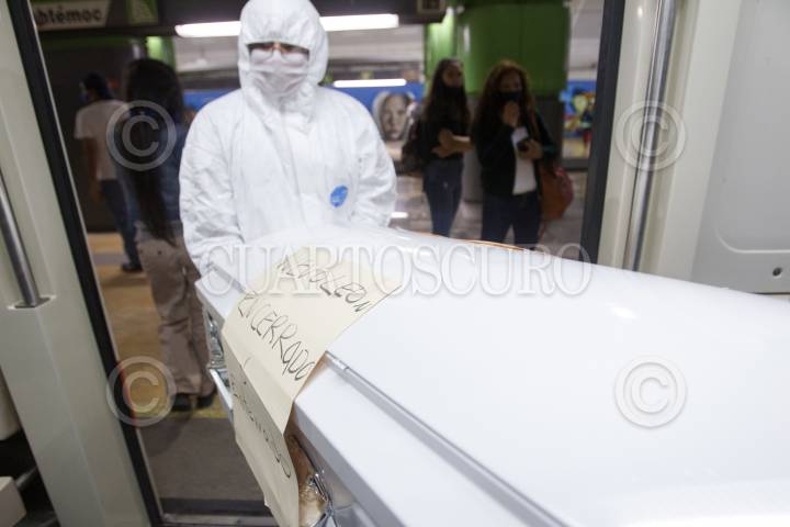 MONTERREY, NUEVO LEÓN, 17ABRIL2020.- Un ataúd con la frase "encerrado o enterrado" es llevado en estaciones del metro de Monterrey por integrantes de la asociación "Haz que suceda" fundada por Candelario Maldonado como parte de la campaña de concientización para quedarse en casa durante la emergencia santaria por el coronavirus covid-19. FOTO: GABRIELA PÉREZ MONTIEL / CUARTOSCURO.COM