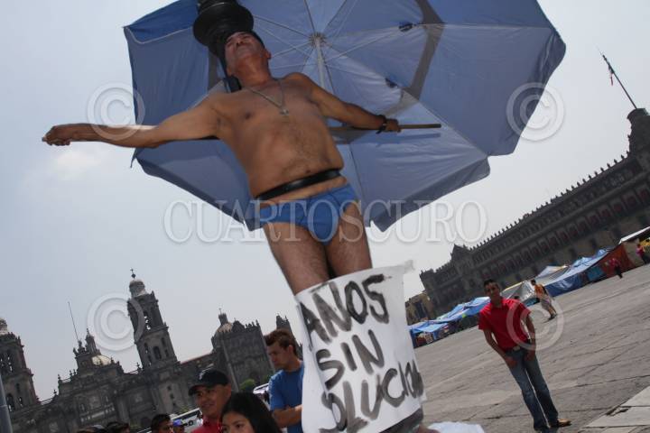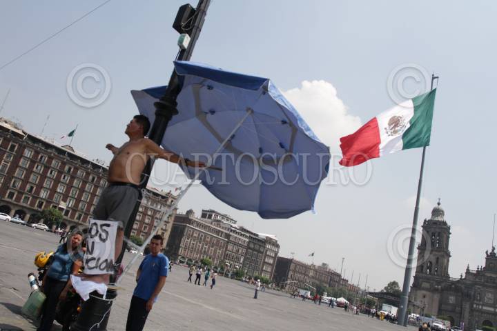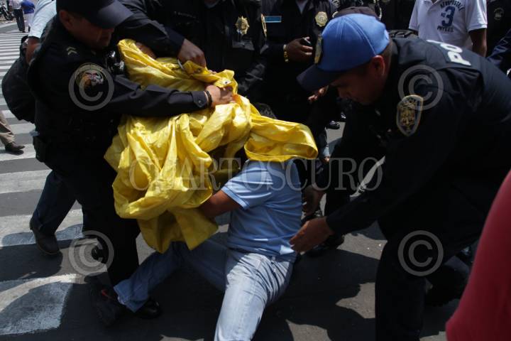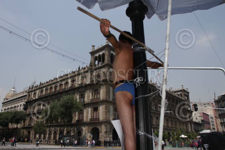MÉXICO, D.F., 10JUNIO2013.- Vendedores ambulantes desalojados del Metro Auditorio se manifestaron enfrente de la Sede del Gobierno del D.F. para exigir su reinstalación. Intentaron cerrar la calle 20 de Noviembre, sin embargo un grupo de policias les impidió su protesta, y enmedio de jaloneos fueron retirados. Uno de ellos se crucificó simbolicamente en uno de los postes de la plancha del zócalo. FOTO: JUAN PABLO ZAMORA /CUARTOSCURO.COM