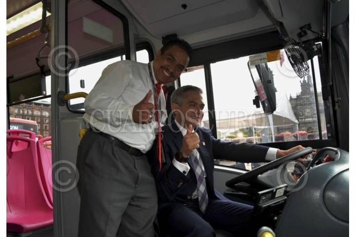 CIUDAD DE MÉXICO, 21JUNIO2016.- El Jefe de Gobierno de la Ciudad de México, Miguel Ángel Mancera Espinosa, dio el banderazo de salida a 38 autobuses biarticulados, articulados y de entrada baja con tecnología ambiental Euro V, los cuales reforzarán el servicio que reciben usuarios del Sistema Metrobús, y que significó una inversión de 215 millones de pesos. FOTO: CUARTOSCURO.COM