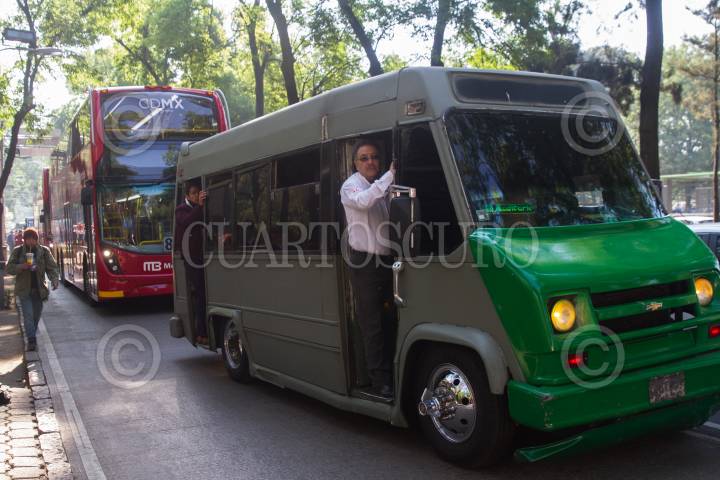 CIUDAD DE MÉXICO, 05MARZO2018.- Con un intenso tráfico se registro avenida Reforma a la altura del metro Auditorio, punto en donde los usuarios tienen que tomar otro transporte para dirigirse a puntos como Santa Fe, ya que el Metrobus Línea 7 solo corre de Indios Verdes a Campo Marte. A pesar de que el Jefe de Gobierno, Miguel Ángel Mancera, había señalado que al final de su administración los microbuses iban a desaparecer como medio de transporte público, siguen transitando en avenida Reforma junto con los modernos metrobuses doble piso. FOTO: MOISÉS PABLO /CUARTOSCURO.COM