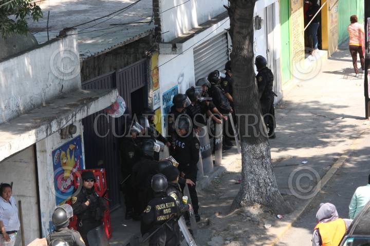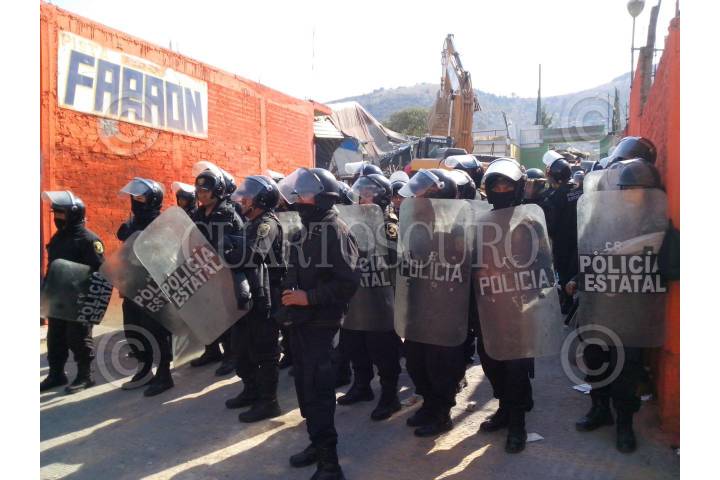 ECATEPEC, EDOMEX, 19FEBRERO2015.- Habitantes de las Colonias Santa Clara y San Andrés de la Cañada serán desalojados de algunos predios, donde el Gobierno del Estado construirá las estaciones del Mexicable, vecinos argumentan que son dueños de los terreno y que las autoridades en ningún momento negociaron la expropiación de estas tierras. En "El Mezquital" Santa clara terreno de 900 metros cuadrados ya comenzó la demolición de las estructuras donde habitaban familias y comercios. Policías Estatales Granaderos y municipales entraron al terreno asegurando que las maquinas hicieran los trabajos, se viven momentos de tensión debido a que los pobladores no quieren que ingresen las pesadas maquinas. FOTO: DIEGO REYES /CUARTOSCURO.COM