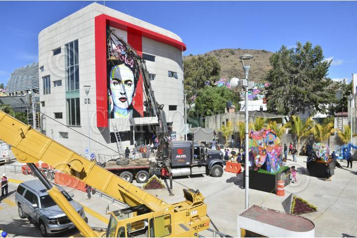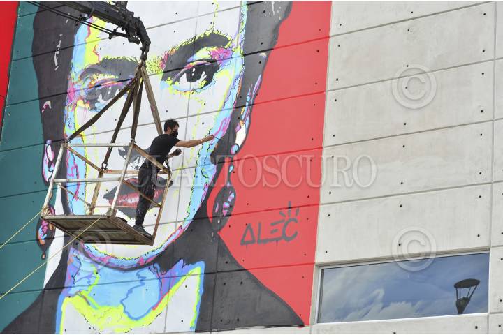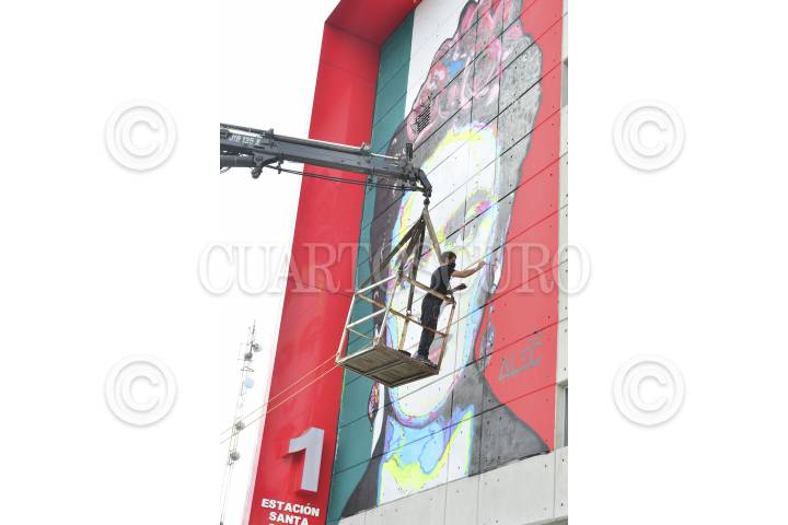 ECATEPEC, ESTADO DE MÉXICO, 05DICIEMBRE2016.- El artista callejero Alec Monopoly da los últimos toques a su obra Frida, que fue plasmada en la estación Santa Clara del sistema Mexicable. FOTO: LUIS SOTO /CUARTOSCURO.COM
