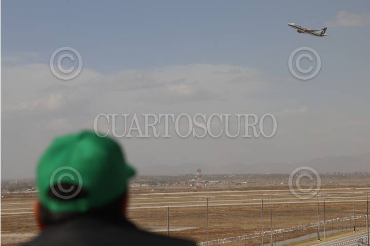ZUMPANGO, EDOMEX, 09ENERO2025.- Una persona observa el despegue de un avión de la aerolínea Mexicana de Aviación desde el mirador del AIFA. FOTO: DANIEL AUGUSTO/ CUARTOSCURO.COM