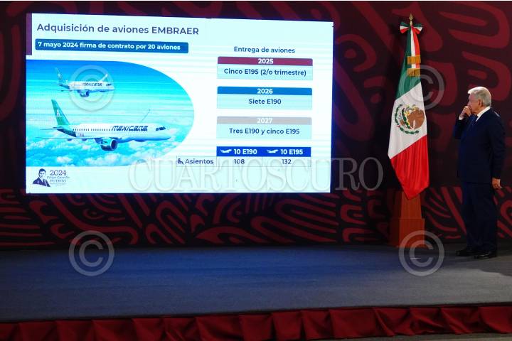 CIUDAD DE MÉXICO, 07JUNIO2024.- Andrés Manuel López Obrador, presidente de México, Leobardo Ávila, director general de la Aerolínea del Estado Mexicano, durante la conferencia matutina en la cuál se abordó el tema de la compra de aeronaves para Mexicana de Aviación, esto desde el Salón Tesorería de Palacio Nacional. FOTO: ROGELIO MORALES /CUARTOSCURO.COM