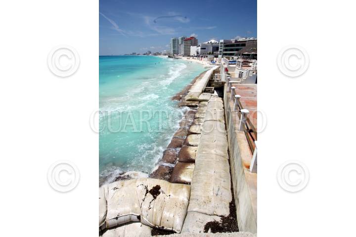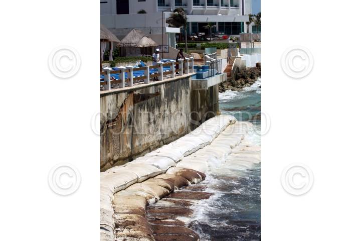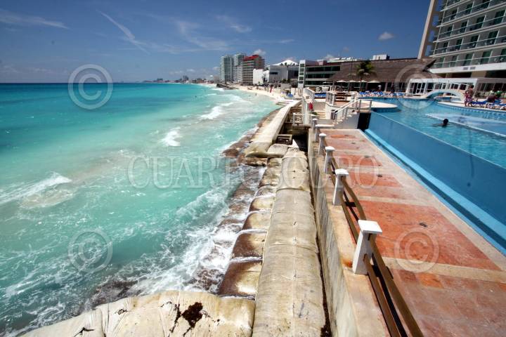 CANCÚN, QUINTANA ROO, 17SEPTIEMBRE2009.- El próximo 20 de Septiembre llegarán finalmente a Cancún, las dragas que se encargarán del vertido de arena en las playas de este destino turístico, como parte de los trabajos del proyecto de recuperación de playas; en un principio se construirán las estructuras de cierre que evitarán que la arena se deslice hacia el mar, en la foto un claro ejemplo de la erosion de playas en un hotel ubicado en punta Cancún. FOTO: AMARANTA PRIETO/CUARTOSCURO.COM
