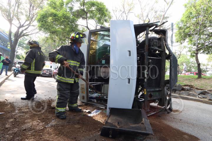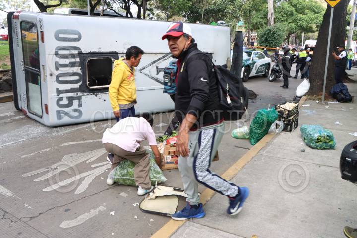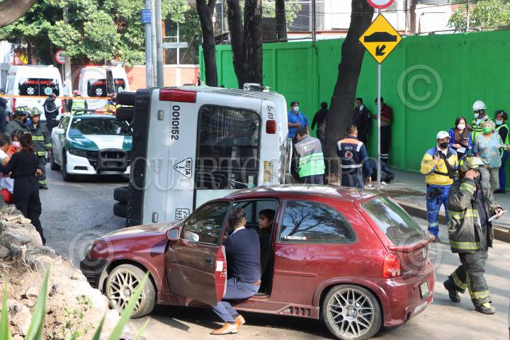Un microbús volcó tras chocar con un Chevy en la lateral de Churubusco, en la colonia El Sifón. El incidente dejo como saldo 13 heridos.