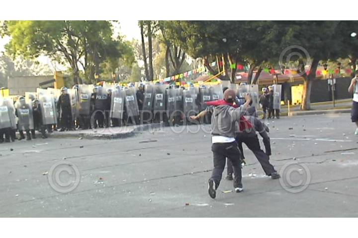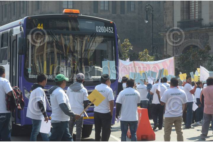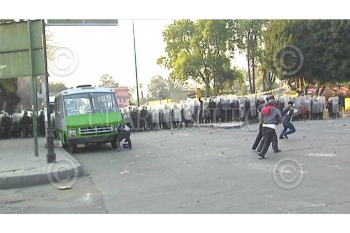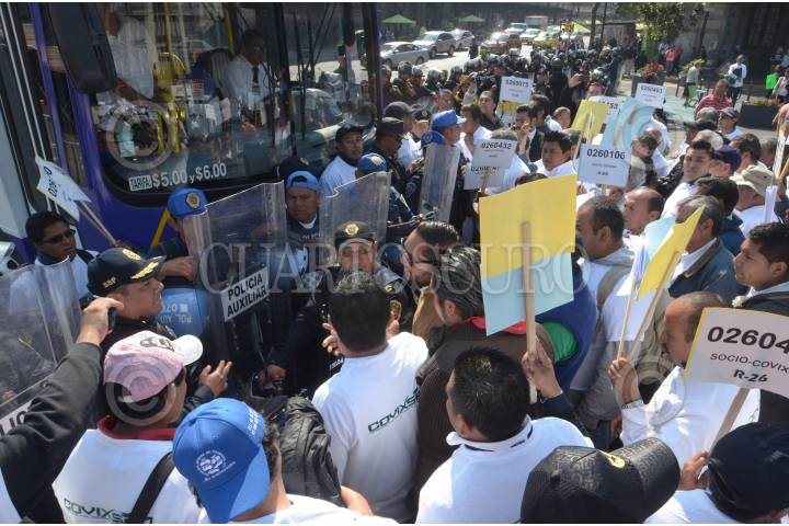MÉXICO, D.F., 19ENERO2015.- Microbuseros de la Ruta 26 se manifestaron en el Zocalo de la ciudad de México, en demanda de que el gobierno del D.F. les cumpla lo que les prometieron e intentaron subir una unidad a la plancha del Zócalo y granaderos se los impidieron. FOTO: CUARTOSCURO.COM
