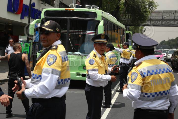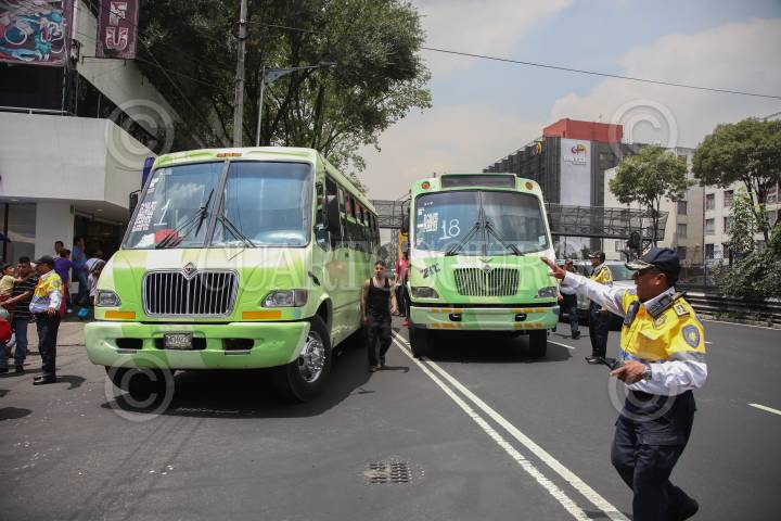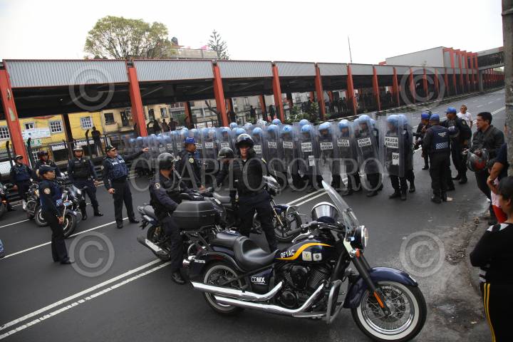 MÉXICO, D.F., 17JULIO2015.- Microbuses de distintas rutas se manifestaron bloqueando la calzada de Tlalpan, al rededor de 500 personas que se transportaban en las unidades intentaron marchar por la avenida hasta que granaderos de la SSP-DF les impidieron el paso a la altura del Metro San Antonio Abad. FOTO: SAÚL LÓPEZ /CUARTOSCURO.COM