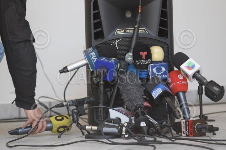 Micrófonos de periodistas en una bocina durante una conferencia en la embajada de Ucrania.