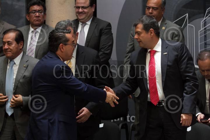 CIUDAD DE MÉXICO, 11JUNIO2018.- Pablo Moctezuma Barragán, delegado de Azcapotzalco, y José Ramón Amieva, Jefe de Gobierno, al finalizar la presentación del micrositio "Juntos contra la corrupción", el cual ayudará a la personas que realizan algún trámite en las oficinas del gobierno local puedan realizar un denuncia en línea si son objeto de un acto de corrupción. FOTO: MOISÉS PABLO /CUARTOSCURO.COM