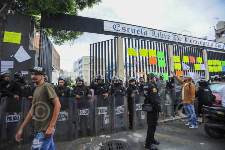 CIUDAD DE MÉXICO, 29MAYO2025.- Se suscitó un conato de riña durante la protesta por el cierre de la Escuela de Homeopatía de México, ubicada en la calle de Peralvillo, alcaldía Cuauhtémoc. Estudiantes de este centro de estudios y vecino se oponen a que este inmueble sea transformado en albergue para migrantes, una medida que fue anunciada por el secretario de Gobierno, César Cravioto. La confrontación se dio cuando llegaron autoridades del Gobierno de la Ciudad de México a asegurar al inmueble, pero los vecinos se opusieron, granaderos de la SSC acordonaron la zona y desalojaron a varias personas que ya se habían colado al edificio. Los inconformes señalan que su rechazo a esta decisión es que nunca fueron consultados y temen a que la presencia de los extranjeros aumente la inseguridad en su colonia. FOTO: IKARI/CUARTOSCURO.COM