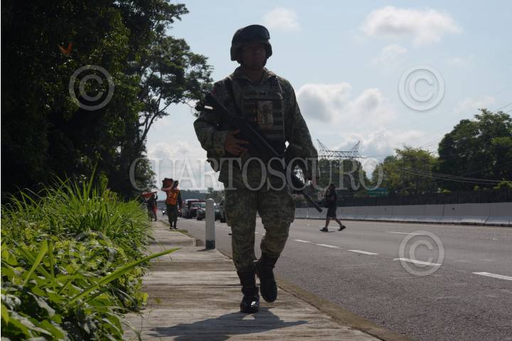 TAPACHULA, CHIAPAS, 08JUNIO2019.- Los retenes del Instituto Nacional de Migración continúan en las entradas y salidas del municipio, resguardados por elementos del ejército, marina y policía federal. Detienen autobuses, transporte público y autos con placas de Guatemala. Algunos elementos del ejercito mantienen un retén antes de llegar al Puente El Manguito, y reducen la carretera a un carril. FOTO: ISABEL MATEOS /CUARTOSCURO.COM