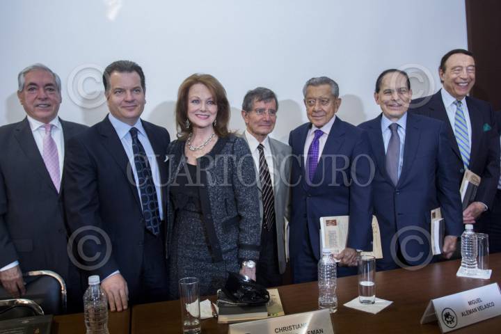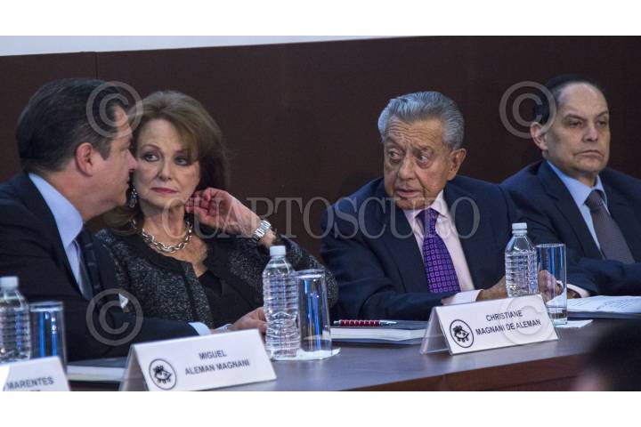 MÉXICO, D.F., 14MAYO2015.- Alejandro Carrillo Castro, Miguel Alemán Magnani, Christiane Magnani de Alemán, Miguel Alemán Velasco, Jorge Alemán Velasco, Manuel Marrón González y David Surur Edid al termino del informe de la Fundación Miguel Alemán Valdés. FOTO: ENRIQUE ORDÓÑEZ /CUARTOSCURO.COM