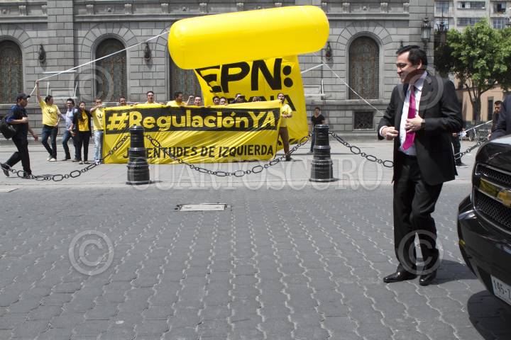 CIUDAD DE MÉXICO, 06ABRIL2016.- Miguel Ángel Osorio Chong, secretario de Gobernación, llega al Palacio de Minería, en donde se realizó el quinto foro "Debate Nacional sobre el Uso de la Mariguana. Al fondo se observa una manta de las juventudes de Izquierda del PRD con la leyenda "legalización ya". FOTO: MOISÉS PABLO /CUARTOSCURO.COM