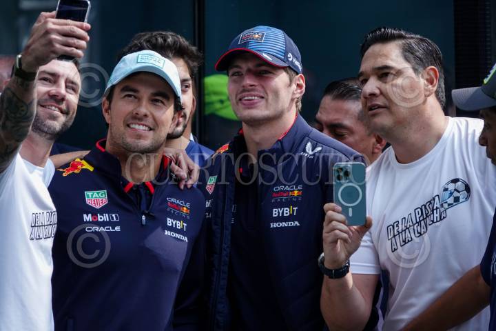 CIUDAD DE MÉXICO, 23OCTUBRE2024.- El ex futbolista Miguel Layún, los pilotos de Fórmula 1 Sergio “Checo” Pérez y Max Verstappen, así como el ex futbolista Moisés Muñoz se fotografían durante el evento de la Pista a la Cancha con motivo del Gran Premio de la Ciudad de México de la Fórmula 1. FOTO: GALO CAÑAS/CUARTOSCURO.COM