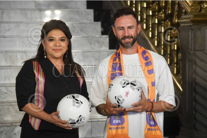 CIUDAD DE MÉXICO, 07MAYO2025.- Clara Brugada, jefa de Gobierno, y Miguel Layún, ex futbolista profesional mexicano, durante la presentación de "Ciudad Mundialista" que marca el proyecto de las actividades turísticas a 400 días del Mundial de futbol 2026 que tendrá como una de sus sedes la capital. FOTO: MARIO JASSO/CUARTOSCURO.COM