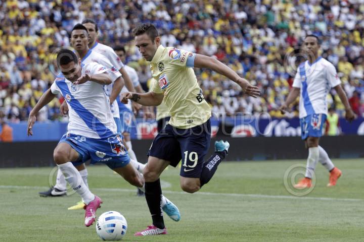 PUEBLA, PUEBLA, 02AGOSTO2014.- El Puebla de la Franja sufrió un descalabro en casa tras ser derrotado por las Águilas del América con marcador de 4-0 en partido correspondiente a la jornada 3 del torneo de apertura 2014 del fútbol mexicano. En la imagen el defensa americanista Miguel Layún. FOTO: HILDA RÍOS /CUARTOSCURO.COM