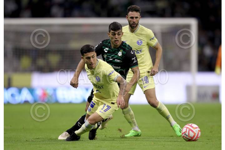 Alejandro Zendejas y Miguel Layún de America durante el partido de fútbol América vs Santos correspondiente a la jornada 5 del Torneo Apertura 2022 de la Liga BBVA MX, en el estadio Azteca.