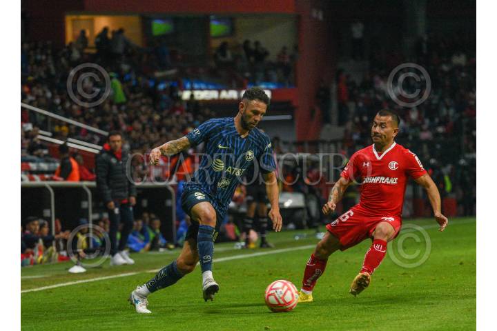 Miguel Layún defensa de las Águilas del América Jean Meneses medio de los Diablos de Toluca durante el encuentro en el estadio Nemesio Diez de la Copa Sky.